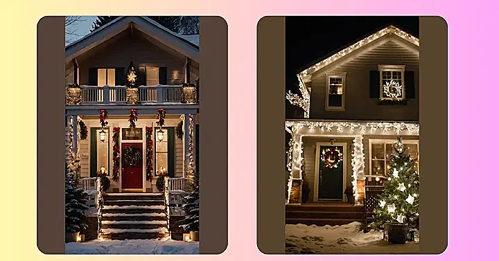 This house looks like it’s straight out of a Christmas movie! Imagine snuggling up inside with hot cocoa, watching the snow fall softly, and seeing all those sparkly outdoor Christmas lights twinkling on the roof and eaves. It’s like someone sprinkled magic dust all over the place, turning a simple house into a winter wonderland. Those lights are definitely brighter than my math test grades, but in a good way!