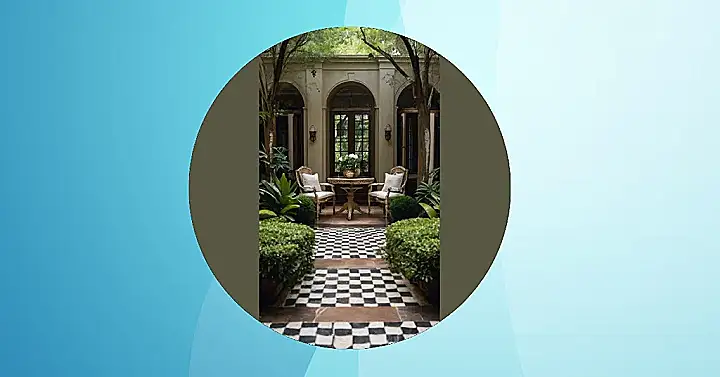 This place looks like someone took all the cool bits from a fancy Southern mansion and shrunk it down to pocket size! Think of it: a secret garden, perfect for chilling with a sweet tea and a good book. The black and white checkerboard floor makes it feel like you’re stepping into a giant game of chess. Just don’t let the potted plants get any funny ideas and start moving themselves around – that would be a seriously weird afternoon.