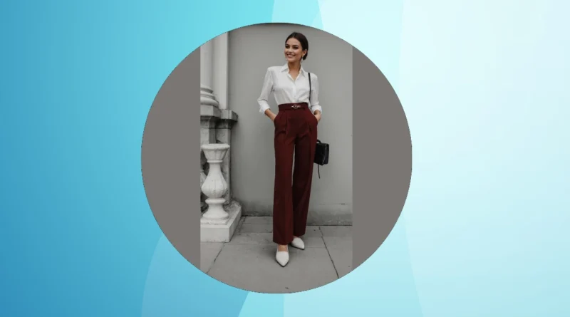 Looking at this outfit, you might think, “Wow, she looks like she’s ready to ace a presentation or maybe even run a whole company!” That crisp white shirt and those awesome maroon trousers are giving off serious “I’ve got this” vibes. It’s like when you try to look super grown-up for a school event, but she actually pulls it off with a smile that says, “Yeah, I look good, and I know it!” It just goes to show that trousers aren’t just for school uniforms or boring grown-up stuff; they can be totally stylish and make you feel like a total boss.