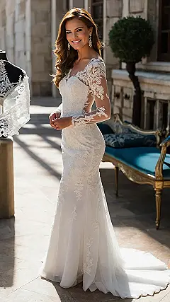 This dress is like something out of a movie! Imagine yourself as a princess, walking down a grand staircase (just like in the picture!), in a stunning long-sleeve mermaid wedding dress. The lace is so intricate and beautiful; it’s like a thousand tiny flowers blooming all over the gown. You’ll feel like a total queen, ready to say “I do” and start your happily ever after. It’s the perfect blend of elegant and fun, making it the ideal dress for a bride who wants to look amazing and feel super confident on her big day.