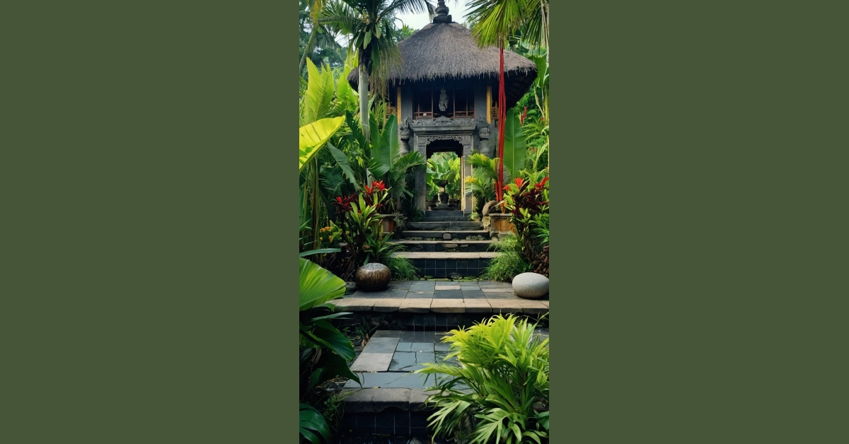 The air is filled with the subtle fragrance of exotic blooms, transporting your senses to a realm of tranquility and serenity. Resting under the shade of a swaying palm tree, the sound of a trickling water feature lulls you into a state of deep relaxation. Balinese statues peek through dense tropical foliage, adding an element of mystique and wonder to this lush garden paradise.