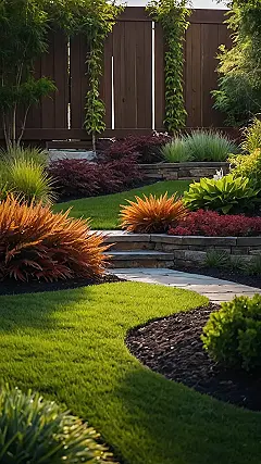 This backyard is like a whole new world! It’s got lush green grass that’s softer than your favorite pillow, and a stone path that winds around like a fun, twisty road. It’s so cool that you could even imagine a tiny gnome riding a ladybug down the path! But the real stars of this show are the plants. They’re all different shapes and sizes, like they were picked from a garden catalog that only a super-stylish gnome would own. This backyard is proof that even your boring old yard can become a total paradise with some modern landscaping magic!