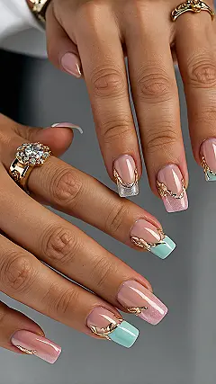 These nails are screaming ‘summer vacation’ louder than your alarm clock on a Monday morning! With that perfect peachy-pink base and those cool mint green and shimmery pink tips, they look ready for any pool party or beach day. But hold up, did you notice those fancy gold details? It’s like someone dipped their fingertips in pure sunshine and then added a little bit of ancient treasure map magic. Trying to do something this intricate yourself would probably end with more gold on your desk than on your nails, which is why we’re totally impressed!
