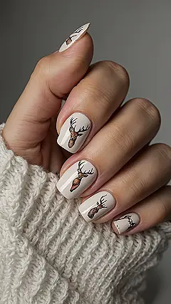 Get ready to say ‘Oh deer!’ because these nails are absolutely adorable and totally ready for their close-up! Who knew a herd of majestic deer could look so awesome chilling out on your fingertips? These aren’t just any old designs; each nail shows off a detailed deer head, complete with impressive antlers, all set against a super chic, neutral background. They’re giving off major cozy vibes, especially with that comfy sweater in the picture – perfect for sipping hot chocolate or just looking fabulous during chilly weather.