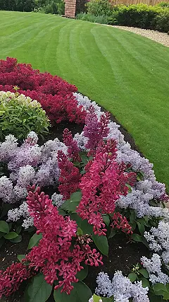 This garden looks like it’s definitely dressed to impress. The grass is all perfectly striped up like it just got a million-dollar haircut, probably feeling pretty pleased with itself for being so neat. But honestly, the real drama is happening along the edge where the flowers are putting on a full-blown color show. It’s like the lilacs and their colorful crew are lined up for a giant red carpet event, all trying to outdo each other with their fabulous blooms and general flowery awesomeness.