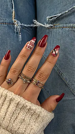 Peeking out from that super comfy-looking white sweater, these nails are giving major cozy chic vibes. It’s like your hands are all bundled up for a crisp autumn day, but still showing off their killer style against those distressed jeans. And honestly, those rings? They’re practically having a sparkling conversation with the shiny red and patterned nails. It’s a whole mood that says, “Yeah, I’m probably curled up with a good book and a warm drink, but my nails are still serving looks!” So grab your favorite chunky knit, and let your nails do all the talking with these adorable plaid designs.