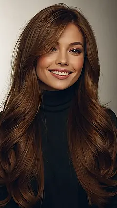 I bet brushing that hair is like a spa day for your hand. All those waves and layers make it look super touchable, and the shine? Forget about it! It’s like she dipped her hair in liquid gold, or maybe just a really good hair mask. Either way, whoever rocks this color definitely knows how to bring the cool chocolate vibes.