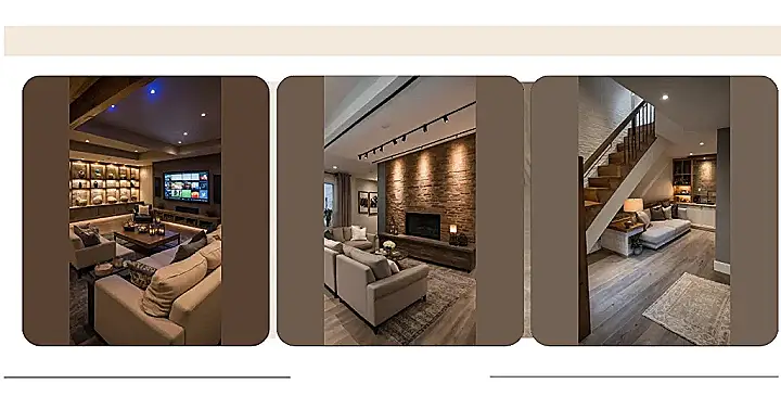 Notice that mega-soft rug? It’s practically daring you to try a wrestling match, but then you’d probably just sink into its comfy goodness. And look at all those different places to plop down: the big sectional, that cool tufted ottoman, and even a squishy beanbag chair for when you want to truly become one with the floor. This place is set up for epic movie nights where the only drama is whether to get more popcorn, or maybe an intense board game session. Just be careful not to roll down those sleek stairs after getting too relaxed; they lead right back to reality!