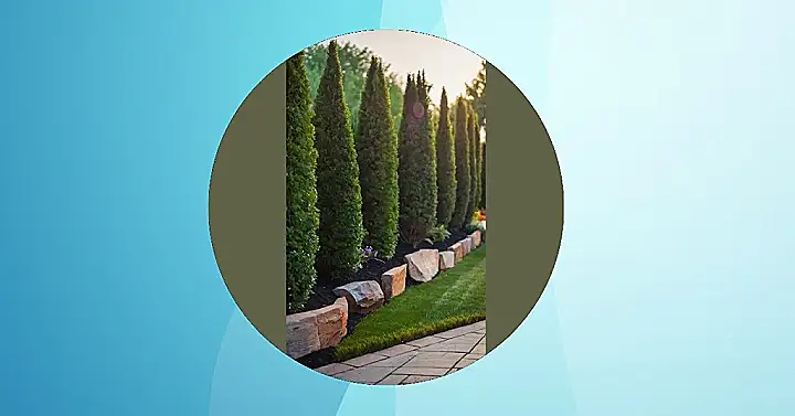 Look at that photo! It’s like a whole army of pointy green trees standing guard at the property line. They’re all lined up so perfectly, like they’re ready for a super serious tree-measuring contest! And those rocks? They’re not just sitting there looking pretty; they’re the ultimate property line protectors, keeping your grass from escaping to your neighbor’s yard!