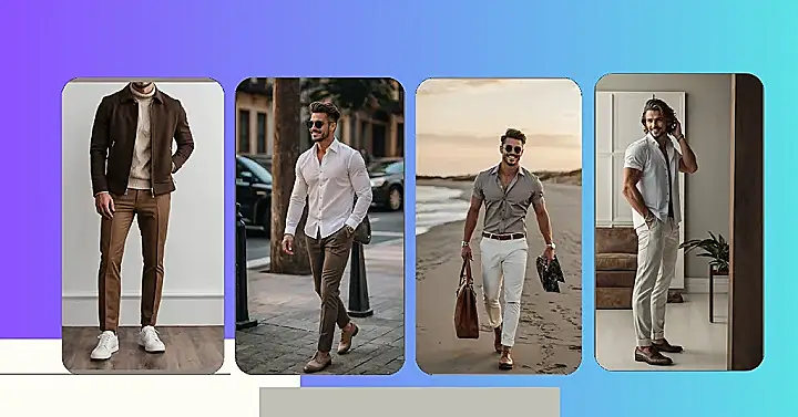 Walking on a beach usually involves flip-flops, sandy feet, and that one t-shirt you don’t mind getting a little wet. But hold up, this guy apparently didn’t get the ‘casual’ memo for his beach stroll! He’s out here looking like he just stepped off a yacht, rocking a super sharp grey shirt, impossibly white pants (seriously, how do they stay that clean on sand?!), and fancy brown shoes. He’s practically making the seagulls feel underdressed with his designer bag and that confident smile, proving that ‘stylish men’s outfits’ can totally include a beach, even if it means dodging rogue waves in your best threads.