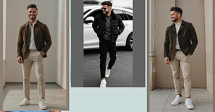 This guy knows what’s up! He’s rocking a brown jacket, a crisp white shirt, and some stylish beige pants. It’s a look that says, “I’m cool, I’m confident, and I’m ready for anything.” But here’s the best part – he’s not wearing a stuffy suit or boring sneakers. He’s got those white kicks that scream, “I’m comfortable and I’m in style.” This is men’s fashion that doesn’t take itself too seriously, but still looks totally awesome!