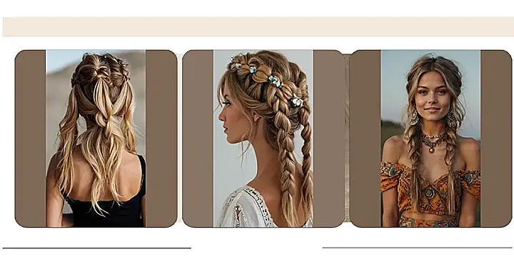 This hairstyle is totally groovy, man! It’s like a modern take on those awesome hippie hairstyles from back in the day, but way more polished. See those braids? They’re not your grandma’s braids; they’re intricate and stylish, kind of like a secret code only cool people understand. It’s the perfect blend of relaxed beach waves and carefully crafted braids—a total vibe. You could totally rock this look at a festival, a summer party, or even just hanging out with your friends.