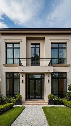 With all those massive windows and the glass balcony, you could totally stage the most dramatic movie scenes or just, you know, creep on your dog playing fetch in the yard without having to go outside. That super neat lawn? It’s so perfect, you’d probably hesitate to walk on it, worried you’d leave a footprint. Plus, that fancy front door looks like it’s guarding secret passageways or maybe just the world’s comfiest couch. It’s the kind of modern pad that makes you think, “Yep, this is where I’d finally learn to do laundry regularly… maybe.”
