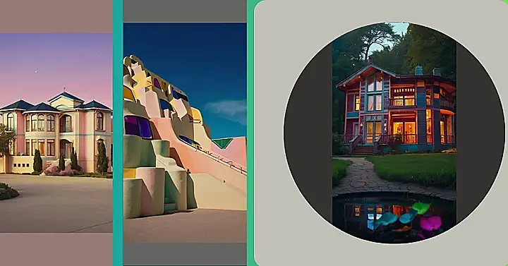 This house is like a giant coloring book that someone went wild on! It’s got all the colours of the rainbow, and even some that you probably haven’t seen before. It’s got a big front door that looks like it leads to a whole new world, and the windows are like stained glass that make you want to stare at them all day.