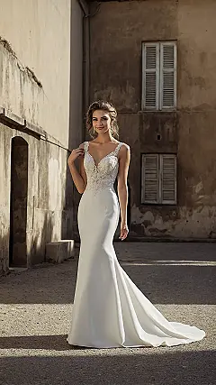 Forget glass slippers, this dress is pure fairytale magic designed for anyone who ever dreamed of being a mermaid (but still wants to walk down an aisle). This style hugs you snug like a cozy seashell wrap before blooming out at the bottom, creating that perfect mermaid tail shape that makes you look instantly glamorous and ready to make a splash – hopefully not literally, unless your reception is poolside. It’s got that flowy drama that screams ‘under the sea… but make it fancy wedding.’