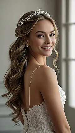Planning your big day and stressing about the hair? Don’t worry, we’ve all been there staring into the mirror, wondering if we can pull off anything other than a messy bun. This hairstyle is seriously gorgeous and it’s totally achievable! The best part? It’s like a fancy half-updo with waves, a sparkly headband, and a flower all in one. It’s giving off serious fairytale vibes, like you’re about to run off with a prince into the sunset.