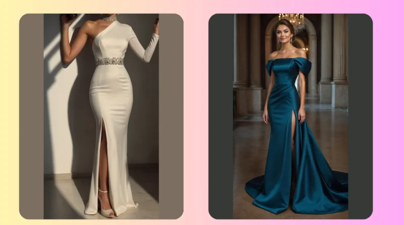 Look closer and you’ll spot some seriously fun details, like the sparkling cutouts on the side that basically say, ‘Yes, I’ve been doing my sit-ups!’ And did you notice the cool one-sleeve situation? It’s like a fashion-forward secret, making sure one arm is ready for a dramatic wave while the other is perfectly chic. Then there’s that high leg slit, practically designed for showing off those awesome heels and making every step down the aisle look like a strut on a red carpet. This dress isn’t just about looking classy; it’s about looking amazing while also having a blast and maybe even a few laughs.
