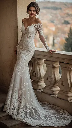Check out this absolute showstopper! If you’re wondering what kind of magic 2025 wedding dresses are brewing, this picture is basically a crystal ball for fabulousness. That intricate lace, those super chic off-the-shoulder sleeves with their cool sheer look, and how it perfectly hugs the body before flowing out – that’s all future trend alert stuff. This dress is giving major main character vibes, making you look like you just stepped out of a fairytale with a serious fashion upgrade, ready to walk down the aisle like you own the place!