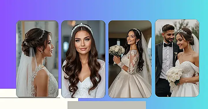 This bride is rocking a gorgeous hairstyle with a veil that’s totally stealing the show! It’s like she’s got a sparkly crown on her head, and the veil is just adding to the magic. Her hair looks super-soft and flowing, and her smile is radiant. You can tell she’s feeling like a princess on her big day!