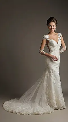 Finding *the* dress is like finding the perfect pizza topping combo: it takes a little looking, but when you find it, you *know*. Take this dress, for example. It’s got those delicate sleeves that are just enough to make you feel fancy, but not so much that you’ll be sweating buckets on the dance floor. Plus, all that lace? It’s like a beautiful secret code only your future spouse will understand, and that’s pretty romantic, right?