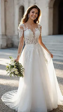 Her smile truly brightens up the whole picture, proving this isn’t just any dress; it’s a masterpiece that likely took a team of incredibly skilled designers to create. The way the delicate lace flowers seem to float across the sheer sleeves and bodice makes it look so light, even though it’s clearly built for maximum wow-factor. She’s definitely ready for her big day, probably planning how to perfectly execute her “casual princess wave.” This wedding gown perfectly captures that dreamy, “happily ever after” vibe, complete with all the sparkles and delicate details.