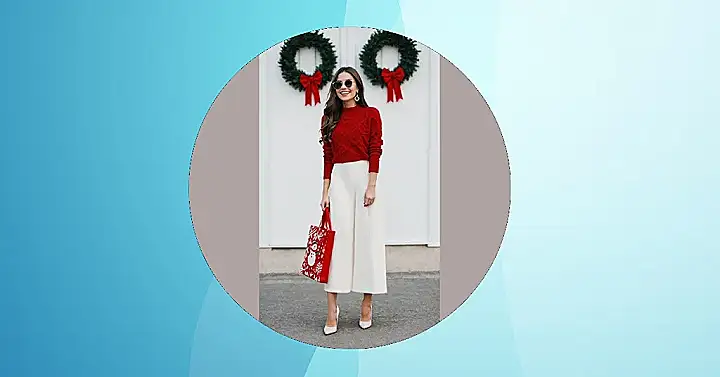 The entire outfit is a holiday mood board come to life! Those crisp, wide-leg pants are basically saying, “I’m comfy, but also ready for all the Christmas cookies,” while those sleek heels and the snowman gift bag seal the deal. With the cheerful wreaths hanging in the background, it’s like she stepped straight out of a holiday movie, proving that Christmas sweater outfits can totally be stylish, fun, and still make you want to burst into carols.