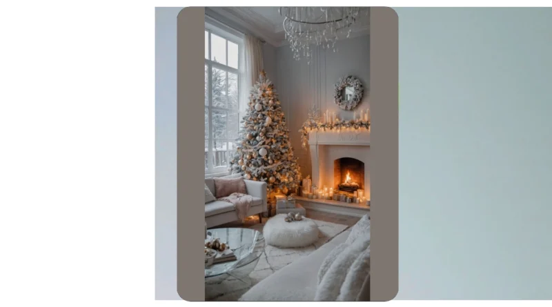 Step right up to the most Instagram-ready spot in the Christmas living room! This mantelpiece isn’t just decorated; it’s practically throwing a silent, elegant party. Look at those little frosted trees, standing tall like a fancy winter forest, probably whispering secrets about who’s getting the best presents this year. And the candles? They’re all lined up, flickering away, probably competing for the “most glow-up” award. You can almost hear them humming festive tunes while making the whole room feel super cozy.