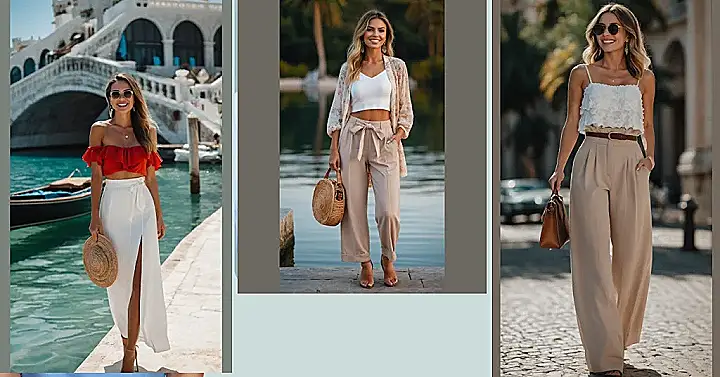 And let’s not forget the accessories that tie this whole vacation vibe together! Those cool shades aren’t just for blocking the sun; they’re for giving off ‘I’m a mysterious vacation goddess’ vibes. Holding that straw hat like it’s a valuable treasure you just found on a gondola ride? Absolutely! This whole look is basically a masterclass in how to make your friends back home jealous while you’re posing perfectly by ancient bridges, pretending you didn’t spend an hour trying to get that skirt slit just right. It’s the ultimate ‘vacation outfits for women’ goal: looking amazing while feeling like you’ve completely escaped all your responsibilities!