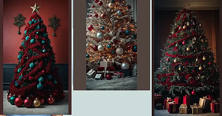 This Christmas tree is definitely not your average green pine. It’s got a bold red and green color scheme that’s like a Christmas card come to life. The tree is completely wrapped in red velvet, making it look so cozy and comfy! The ornaments look like little holiday treasures, and the star at the top is like the finishing touch on a beautiful present. It’s the kind of tree that would make you feel all festive and happy just looking at it!