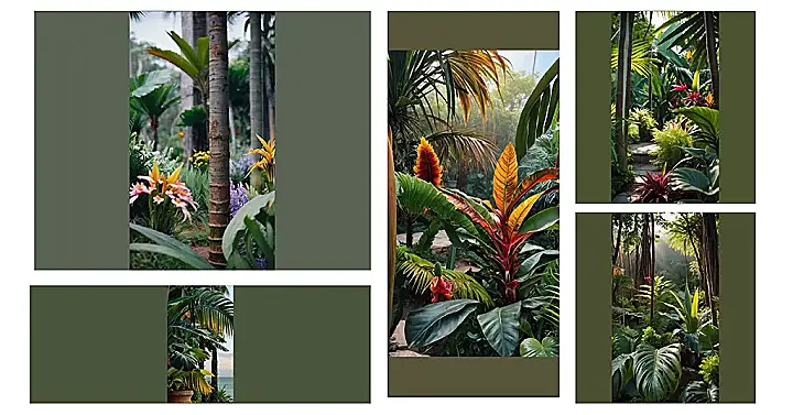 Step into a world where lush green leaves dance under the warmth of a golden sun, creating a paradise that beckons you to explore every corner. Here, vibrant and exotic plants thrive amidst the tranquil serenade of rustling palm fronds and the chorus of chirping tropical birds. Intertwining vines dangle gracefully, providing a whimsical canopy that filters the sunlight into a mesmerizing mosaic of light and shadows.
