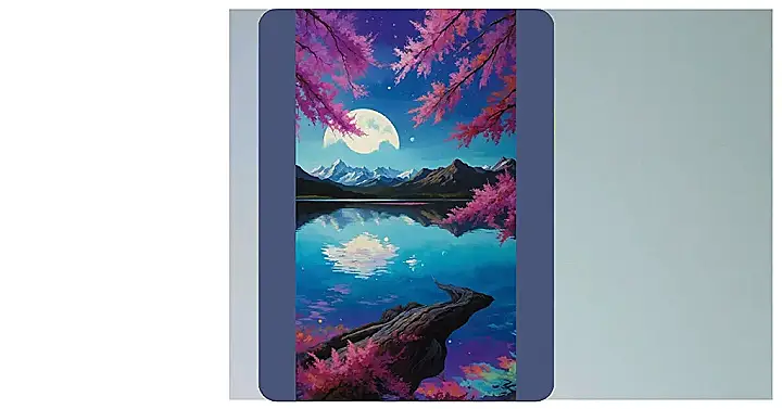 Check out this view! It’s like someone painted a whole other universe where the sky is super blue, the moon is the size of a small car, and cherry blossoms decided to go absolutely wild with the pink. This oil painting background looks so perfect, you almost expect a ‘Loading…’ bar to pop up. It’s got everything: dramatic mountains, a perfectly calm lake reflecting everything like a mirror, and seriously vibrant colours that feel like they’ve been turned up to eleven.