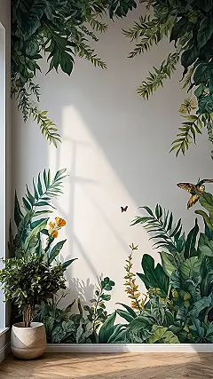 This amazing artistic wallpaper is like having a secret hideaway right in your room, perfect for when you need a break from homework or just want to chill. You can almost feel the gentle breeze through those painted leaves, and that little bird looks ready to fly right off the wall! Plus, it totally makes that real potted plant look like it’s just casually hanging out with its painted buddies. It’s the kind of fun, vibrant wall art that proves you don’t need a green thumb to have a room bursting with life – just some awesome wallpaper!
