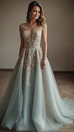 Check out this absolutely stunning dress! It’s giving serious main character energy with all that intricate lace and the way the skirt just flows like a dream. You can practically hear the “oohs” and “aahs” as someone glides down an aisle in this beauty, probably making everyone wish they had a dress this gorgeous. And while it might look like a classic wedding gown, if you look closely, it’s rocking a super chic, subtle hint of color – like a beautiful champagne or soft gold, which is basically the dress equivalent of saying, “I’m fancy, but also I know how to have a good time without being too loud.”
