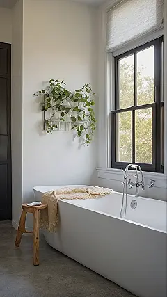 You know how sometimes a wall just stares back at you, looking all blank and unimpressed? Well, not this wall! It’s got a whole squad of leafy green friends hanging out, making the space feel super chill instead of super sterile. It’s like these plants decided the bathtub was their personal jungle gym, gracefully dangling down and probably whispering secrets about the best bath bombs. This isn’t just decor; it’s a botanical paparazzi adding some much-needed life to your soak session, without even needing a filter!