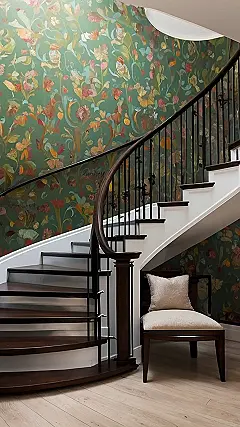 That wallpaper pattern is so cool; it’s like a secret code made of leaves and flowers. I bet if you stare at it long enough, you’ll start seeing hidden staircases to even cooler rooms! Or maybe that’s just me projecting because I really like the cool mix of the wood stairs and the leafy wallpaper.