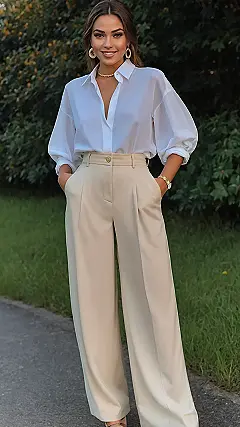 Stepping out in an outfit like this means your weekend plans just got a serious upgrade, whether you knew it or not. You can’t wear those amazing wide-leg pants and a crisp white shirt just to water the plants! This is an outfit for making memories, turning heads, and probably making everyone wonder what incredibly cool thing you’re doing. It’s the ultimate “I’m dressed up but still having fun” look, perfect for a spontaneous fancy coffee run or just feeling like the main character in your own weekend movie.