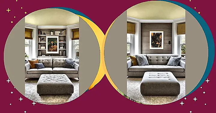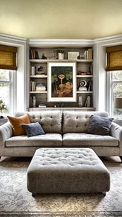 Take a look at this living room – it’s practically screaming ‘sophisticated chill zone’ while also winking, ‘psst, I’m perfect for your next pizza and movie marathon!’ That grey tufted sofa looks like it gives the best hugs, and the matching ottoman is just begging for your feet after a long day (or for holding a mountain of snacks). This is smart home decorating in action, with the pop of gold from the abstract artwork and the window blinds creating a sunny vibe against the cool grey, proving you don’t need a rainbow to make a room feel alive and super cozy.
