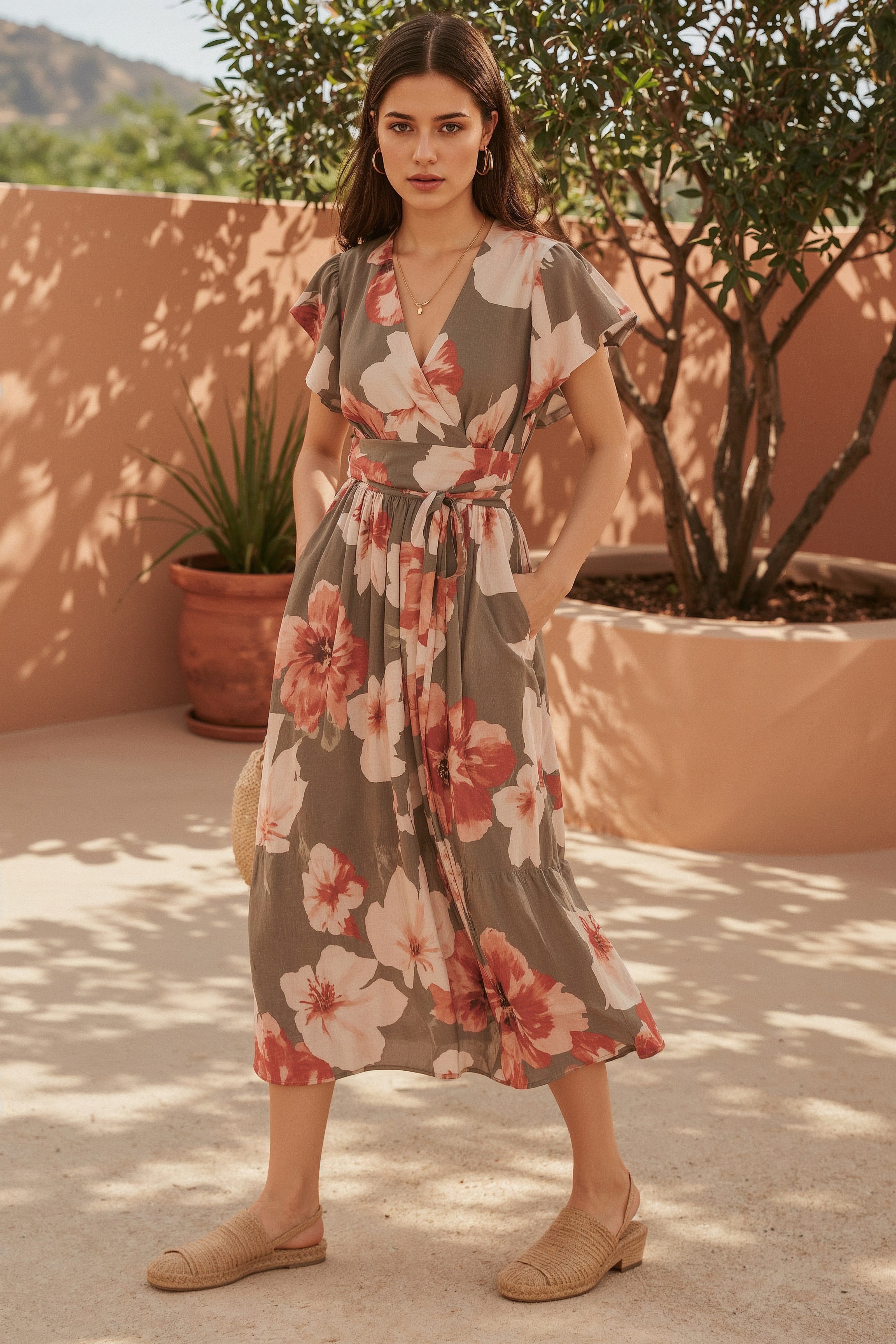 Embrace effortless sophistication with this flowing silhouette in warm, inviting tones, embodying the essence of an old money dress. This garden wedding party outfit perfectly blends timeless charm with the must-have Wedding Guest Floral Dress for spring.
