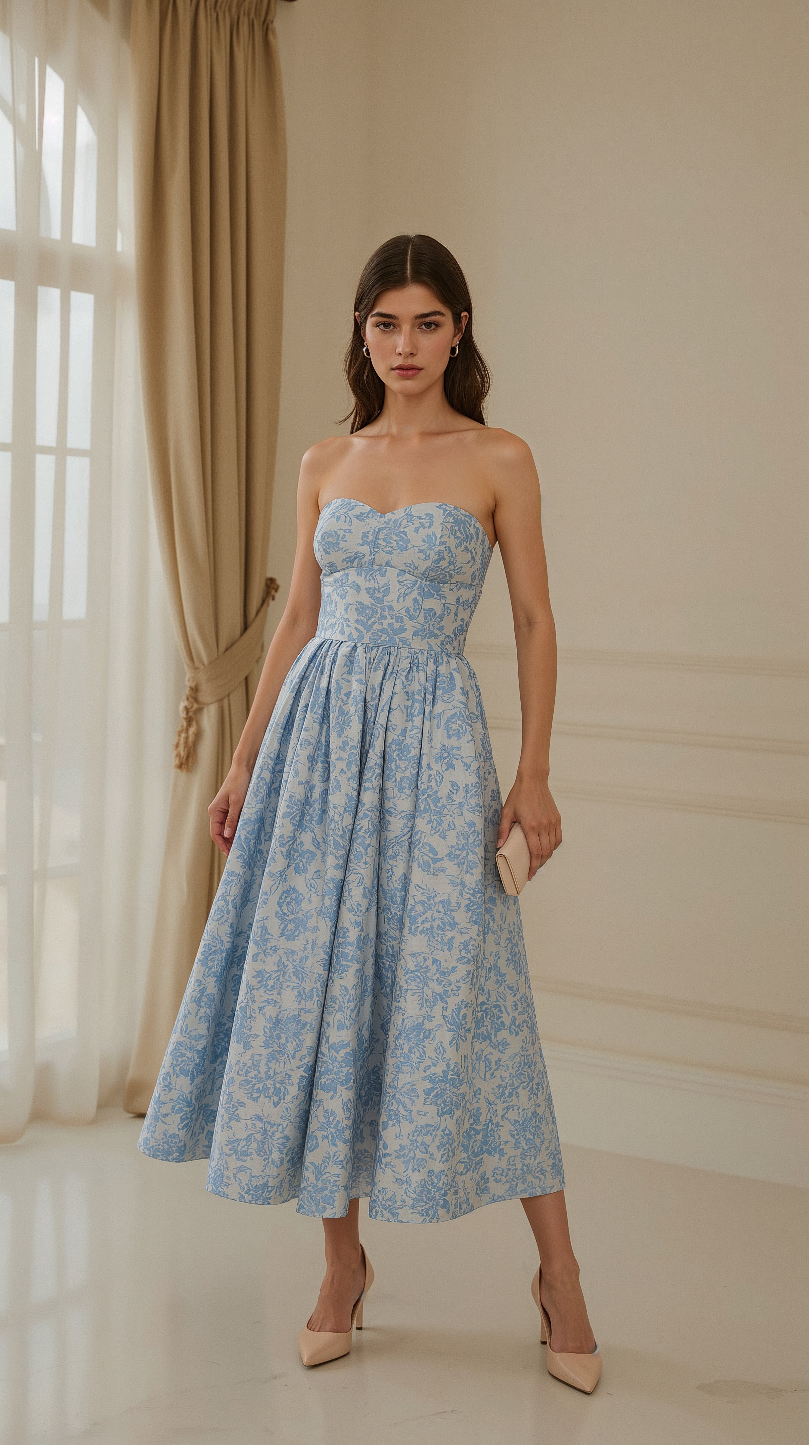 Discover the magic of a blue floral tea-length dress, a perennial favorite for wedding guest outfits. This A-line dress wedding guest silhouette is universally flattering, embodying the latest spring dresses 2025 trends with its structured cut.