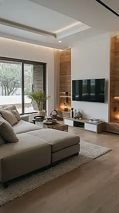 This living room is the ultimate example of trendy home decor done right! It’s like stepping into a magazine spread, with a plush sofa, a huge TV, and a beautiful wooden wall. You could totally imagine relaxing on that comfy couch after a long day, catching up on your favorite show, and maybe even dreaming about the awesome vacation you’ll take someday thanks to all the money you saved by DIYing your own stylish space.