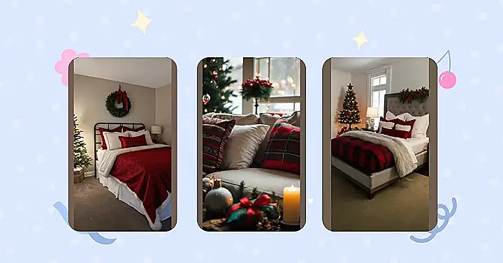 **Paragraph 1:** Whoa, check out this bedroom! It’s like Santa’s workshop threw a pajama party with a super comfy bed. That red and black plaid blanket is seriously begging for a snuggle session, and the fluffy white throw? Pure winter wonderland vibes! Even the headboard’s got a festive garland – talk about Christmas spirit overload! And the tiny Christmas tree? It’s the perfect size for a cozy room, not too big to overwhelm the space. Seriously, this room is holiday goals!