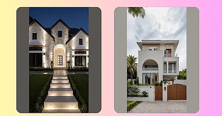 This isn’t just a house; it’s a house that clearly knows a thing or two about making a grand entrance! The front design here is totally flexing with those cool, light-colored stone walls that look like they’ve been perfectly stacked by a master builder. This place looks so put-together, it probably even alphabetizes its spice rack. With the sharp dark trim and cozy glowing lights, it practically invites you to knock and ask if they have any spare Wi-Fi, or maybe a fancy snack, because a house looking this good must have all the good stuff.