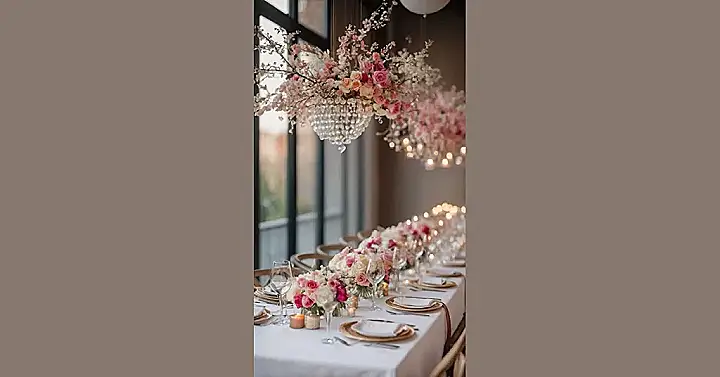 This dinner table decided to have a serious glow-up, transforming into something straight out of a fairytale! We’re talking enough pink and white roses to make a florist blush, gracefully spilling from vases and even hanging from the ceiling like a floral cloud. And don’t miss those crystal chandeliers dripping with elegance – they’ve got more sparkle than a pop star’s stage outfit. This romantic dinner table decor practically screams “special occasion,” making you wonder if you should practice your fancy fork skills or just stare at the breathtaking beauty all night. It’s the kind of setup that makes even a simple glass of water feel incredibly fancy.