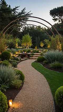And keep going, because wow, check out that spot with the fire pit! It looks perfect for roasting marshmallows or telling slightly-spooky stories under the night sky, with those cool metal arches curving overhead like they’re giving the whole place a giant hug. This whole ‘forest garden’ idea basically takes the best bits of hanging out in the woods – like the awesome trees and peaceful feeling – and mixes it with a super cool garden where you can actually chill without tripping over roots. It’s like nature decided to throw a party and invited all its best-dressed plants, complete with mood lighting.