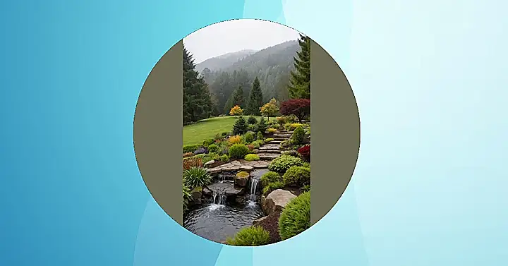 Look at this wild setup! It’s like a fancy garden decided it was tired of being boring and ran off to join the cool forest kids. You’ve got these perfectly placed steps leading you up into the trees, and waterfalls tumbling down like nature is having its own private slip ‘n slide party. The whole scene is a mix of manicured green lawn and unruly forest growth, all blended together with bursts of colorful plants. It totally gives off a vibe of a place where garden gnomes might hang out with squirrels and discuss global squirrel-nut politics. It’s not just a backyard; it’s a whole forest garden adventure waiting to happen!