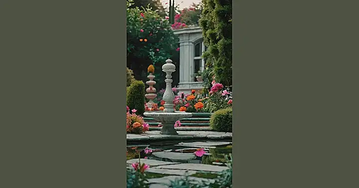 This picture is like a sneak peek into a secret garden, all lush and green with a little touch of magic! It’s a bit like stepping into a fairy tale. Imagine yourself walking past the flowers, their colours bursting like fireworks, until you reach the fountain. The water gurgles and whispers secrets as it trickles down, and you can almost hear the fairies giggling as they flit through the air, maybe even taking a sip from the fountain.