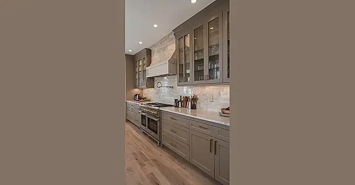 Look at this place! This isn’t just any kitchen; it’s like something straight out of a cooking show where everyone wears crisp aprons and doesn’t accidentally set off the smoke detector. With those sleek gray cabinets, sparkling countertops, and that super-fancy double oven, you could totally pretend you’re a gourmet chef, even if your specialty is mostly microwaved popcorn. All those clear glass cabinets showing off the perfectly stacked glasses just scream “I’ve got my life together,” which is a whole mood we can get behind in this truly designer kitchen.