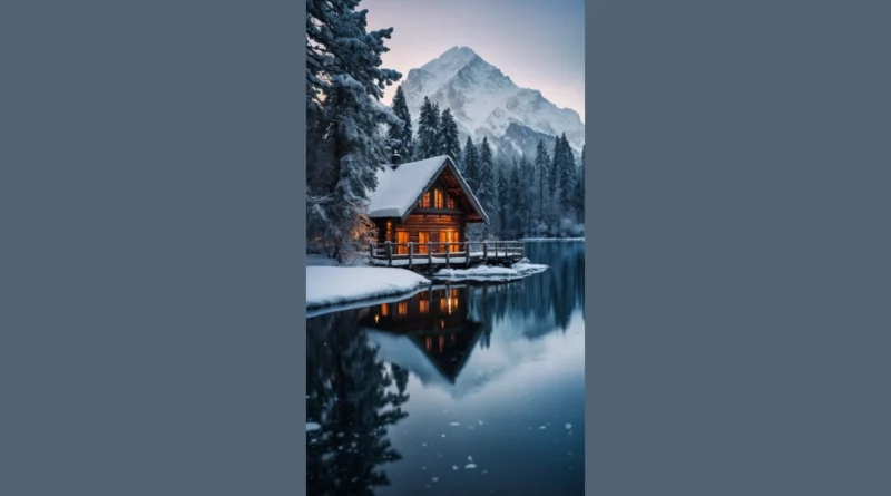 And check out that scenery! With giant, snow-dusted trees and a majestic mountain photobombing in the background, this place is straight out of a movie. The calm lake acts like a giant mirror, reflecting all those pretty cabin lights and making the whole scene double the awesome. It’s like the universe is saying, “Here, have some perfect winter magic.” Just imagine trying to build a snowman out there – you’d probably end up making a snow-angel instead, because, let’s be real, it looks too pretty to disturb!