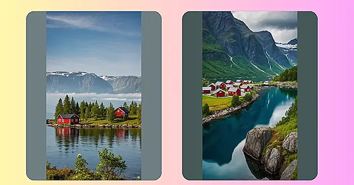 You know that feeling when you try to take the perfect selfie and everything just lines up? Well, this Norwegian landscape basically did that naturally, without even trying! We’ve got these two super cheerful red cabins, looking like they just popped out of a fairy tale, chilling lakeside with their own private forests. They probably spend their days boasting to each other about whose reflection in the glassy water is clearer, while the majestic snow-capped mountains in the background are just silently judging their tiny arguments.