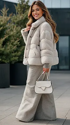 Hey there, fashion-forward friend! Check out this awesome winter outfit. It’s totally giving me “chill Western vibes” meets “city chic.” That fluffy faux fur coat is like a warm hug for your body, perfect for those freezing winter days. Imagine strolling down a snowy Main Street, all cozy and stylish in this look. The black leggings and white sneakers are a modern twist – it’s like you’re ready to conquer the world, one snowy sidewalk at a time. Plus, that black bag? Serious “I mean business” accessory. It’s like a stylish snow day survival kit!